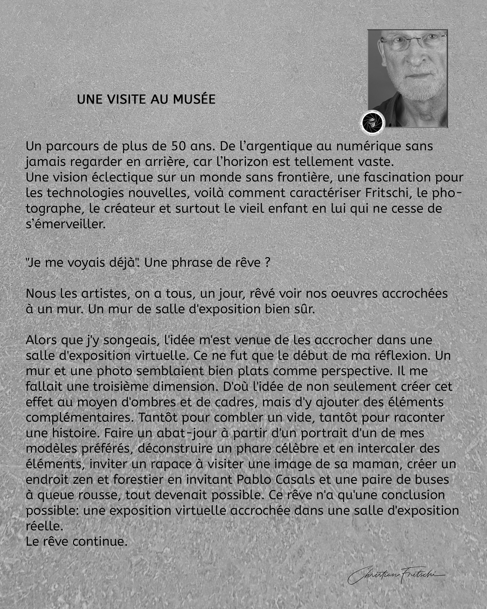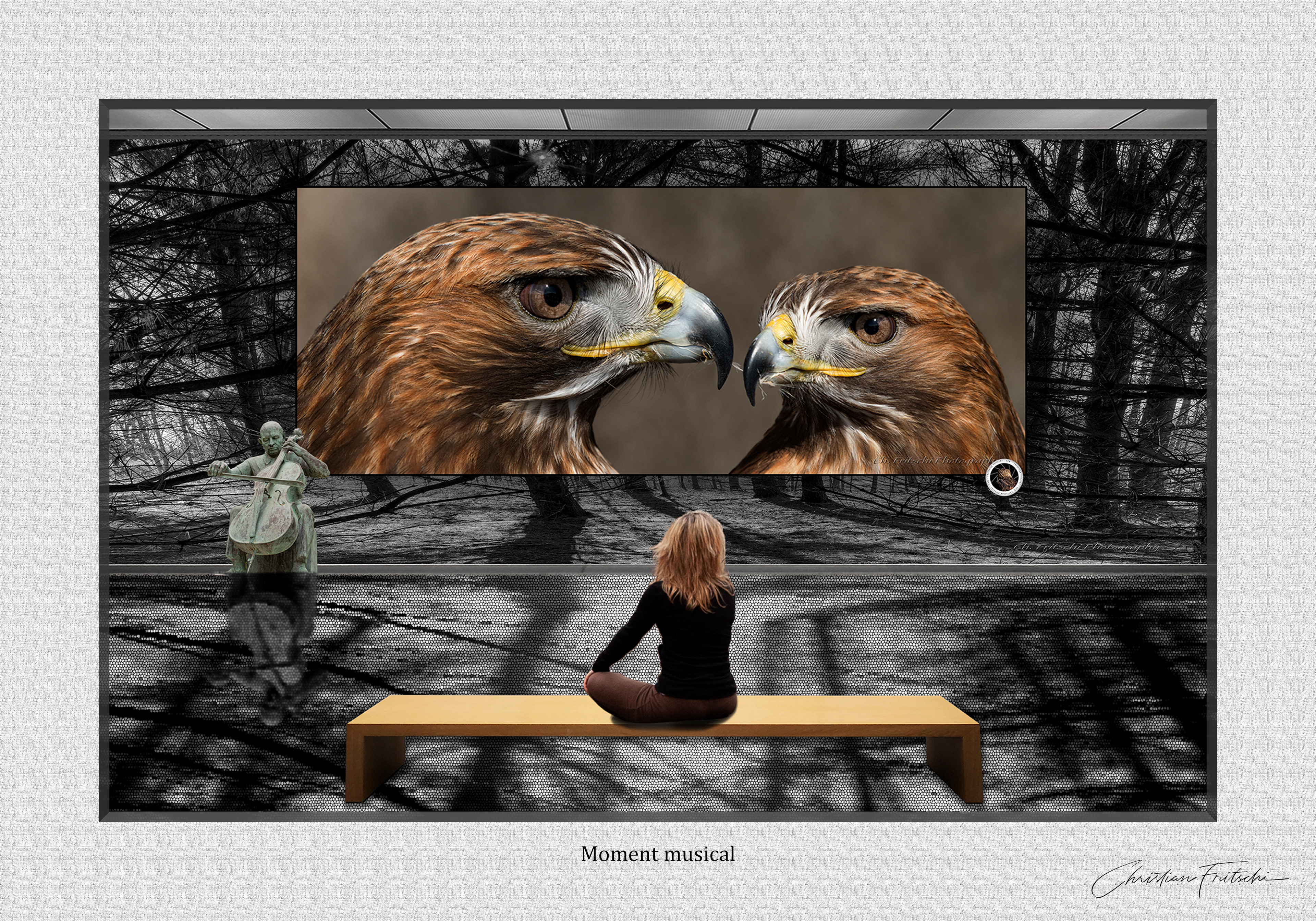 La pandémie, comme pour beaucoup d'entre nous, aura servi à faire une pause. Une période de réflexion intellectuelle sur la photo et mon travail. J'ai donc entamé une série d'images dont le cadre est muséal et chaque image est composée d'éléments qui se remettent en question. Que ce soit le modèle qui passe voir un nu d'elle ou le faucon juvénile qui va rendre visite à sa mère adoptive ou encore le célèbre phare de La Martre que j'ai déconstruit pour l'occasion, mon esprit ne cesse de générer des scénarios nouveaux qui aboutiront bientôt à un recueil sous forme de bouquin.